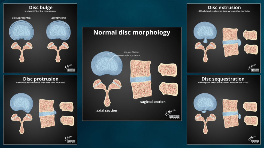 There are 4 types of disc herniations as listed above. A bulging disc is when some of the annulus fibers stretch or become slackened extending a portion of the disc (more than 25% of the circumference) beyond the border of the neighboring vertebrae. A protrusion and extrusion are similar, but are defined by their measurements. A protrusion is wider at its base than it extends away from the normal disc space. An extrusion is narrower at it’s base and extends further away from the normal disc space. A sequestration is a special subclassification of disc herniations where the nuclear material not only pushes out of the normal disc space but it detaches from the rest of the disc.